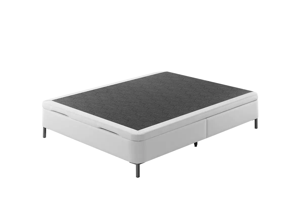 Tal y como lo es el modelo Calio de líneas curvas y dos cavidades en su frente que hacen las veces de discreto y limpio tirador. La pata metálica está disponible en tres acabados distintos: negro, plata y bronce. Tejido antideslizante en la tapa que impide que el colchón se desplace cuando se apertura el cofre.