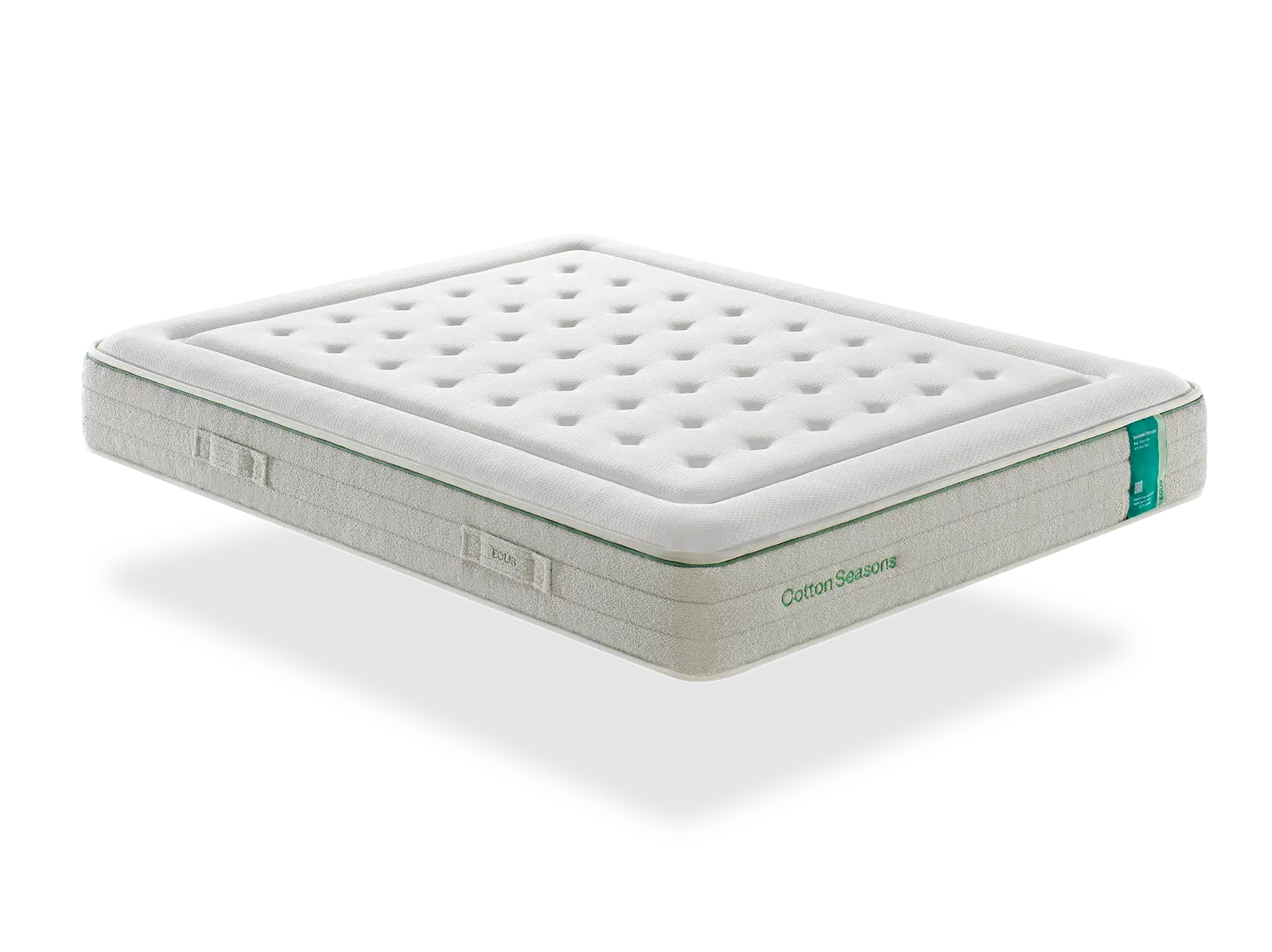Colchón con dos caras, ambas con el suave y transpirable tejido 100% de algodón orgánico. Una de ellas preparada para un tiempo más cálido, con rellenos de fibras de algodón. La otra para tiempos más recios, con fibras de lana en su interior.