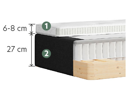 2. Núcleo de muelle ensacado diferenciando 5 zonas de confort para un máximo apoyo. Base de madera de 12 cm de abeto sueco de lento crecimiento con lamas ensambladas y muelle ensacado. Tapicería a elegir.