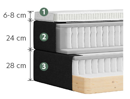 - Sistema de muelles y micromuelle en dos capas: un muelle ensacado más fino para mayor suavidad y comodidad en combinación con muelles ensacados diferenciando 5 zonas de confort.