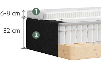 - Sistema de muelles y micromuelle en dos capas: un muelle ensacado más fino para mayor suavidad y comodidad en combinación con muelles ensacados más altos, diferenciando 5 zonas de confort para un óptimo apoyo y ajuste del cuerpo.