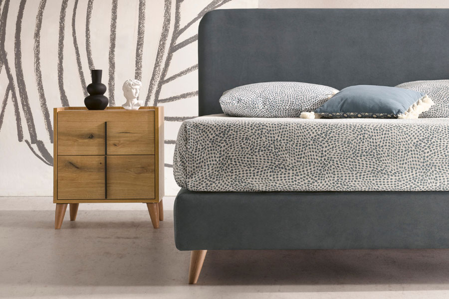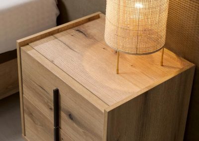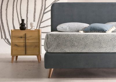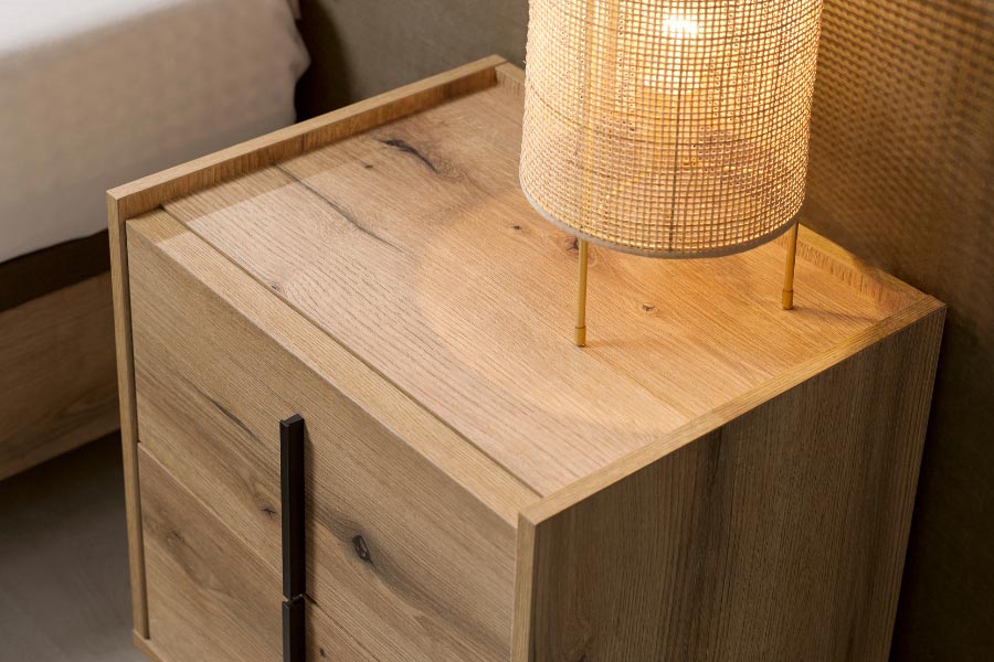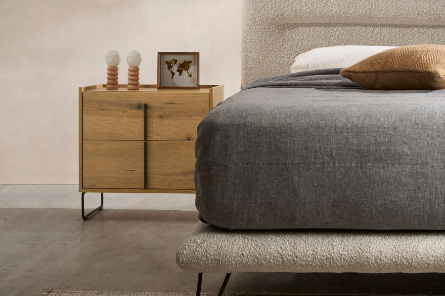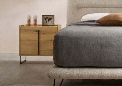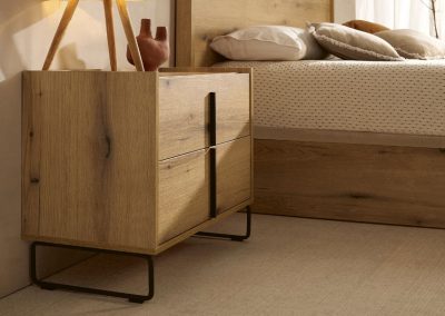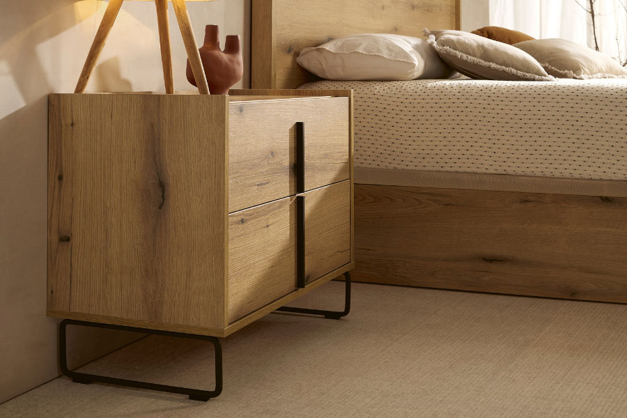 La Mesita Line de dos cajones es minimalista y versátil, con amplio espacio de almacenamiento. Personalízala con patas metálicas o de madera, acabado de madera y tirador en níquel o antracita. Ideal para cualquier ambiente.