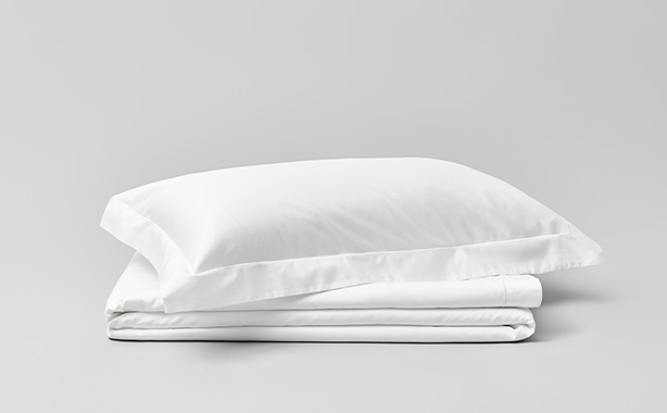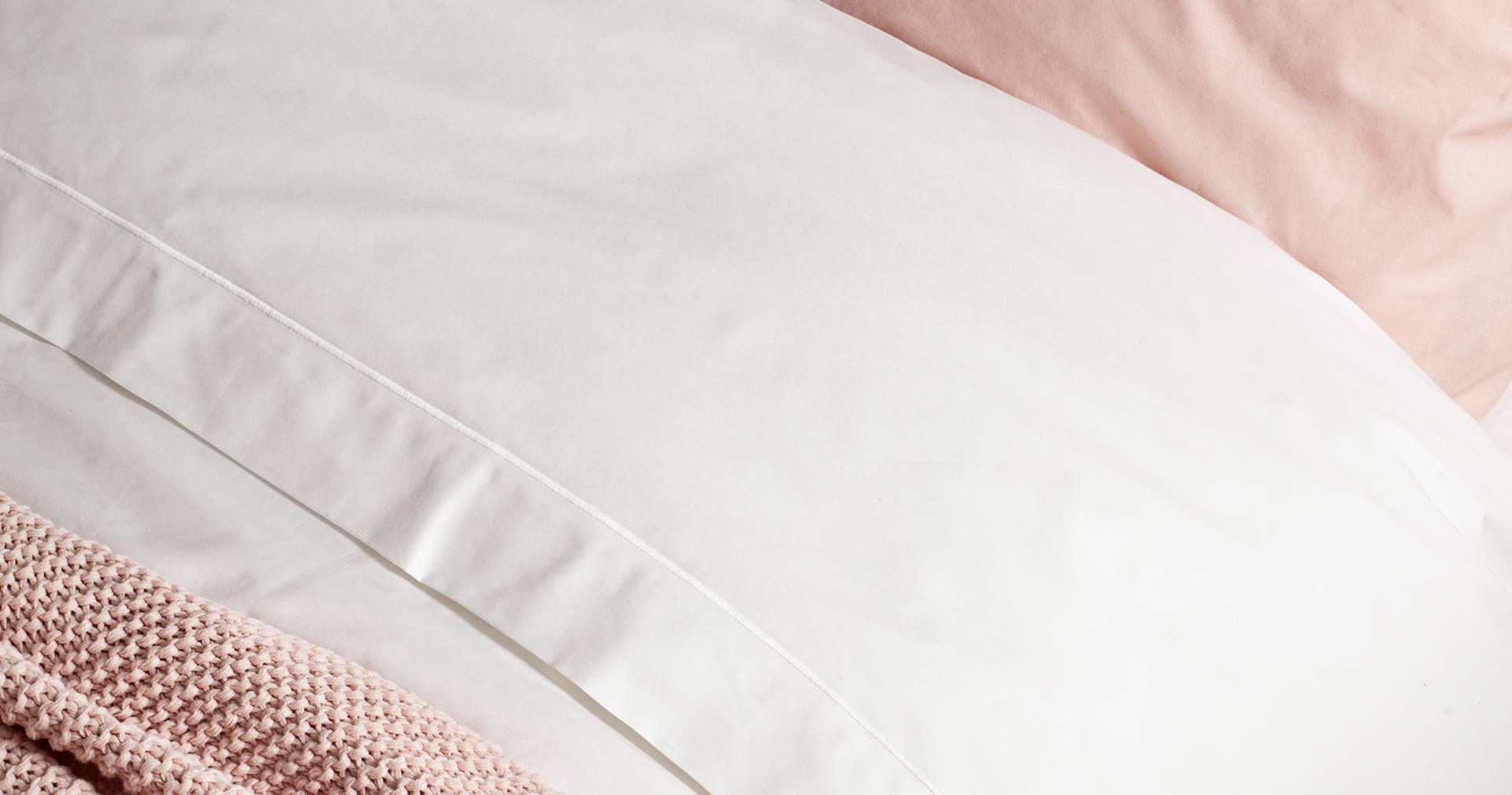 Sábana encimera y fundas de almohadas de algodón peinado y en color blanco; color que representa la pureza, la frescura y la limpieza. Con ribete de color blanco. Disponible en todas las medidas posibles.