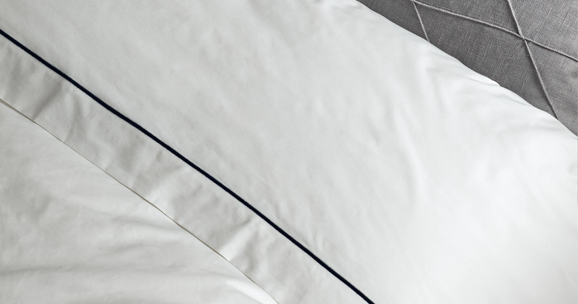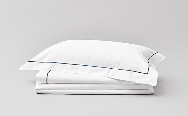 Sábana encimera y fundas de almohadas de algodón peinado y en color blanco; color que representa la pureza, la frescura y la limpieza. Con ribete de color azul. Disponible en todas las medidas posibles.