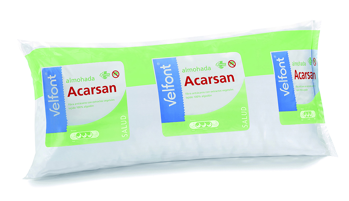 La Almohada Acarsan de Velfont es la almohada perfecta para personas alérgicas a los ácaros ya que está confeccionada con tejido exterior de algodón natural y relleno de fibra hueca y conjugada que incorpora el tratamiento antiácaros Acarsan Natural® con extractos vegetales. Ha sido científicamente testada y su eficacia es resistente a los lavados. Esta almohada ha sido especialmente desarrollada para personas alérgicas a los ácaros, así como para quienes buscan un descanso saludable.