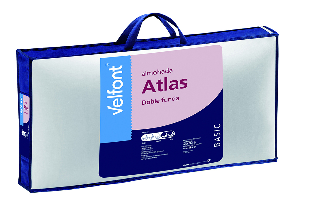 La almohada Atlas de Velfont es la almohada de mayor firmeza de la colección. Está confeccionada con doble funda de tejido 100% algodón y relleno de fibra hueca siliconada y conjugada Neotherm® que aporta volumen, suavidad, ligereza y gran capacidad de recuperación.