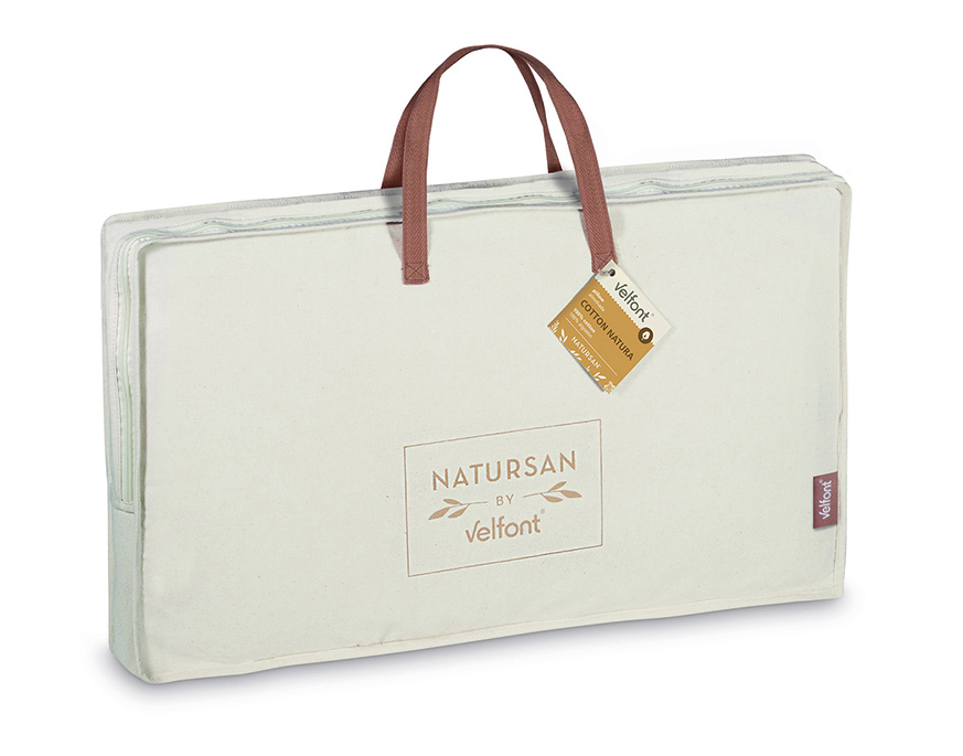 La almohada Cotton Natura viene en una bonita bolsa multiuso confeccionada con algodón canvas de color beige, con asas marrones y cremallera para poder cerrarla.