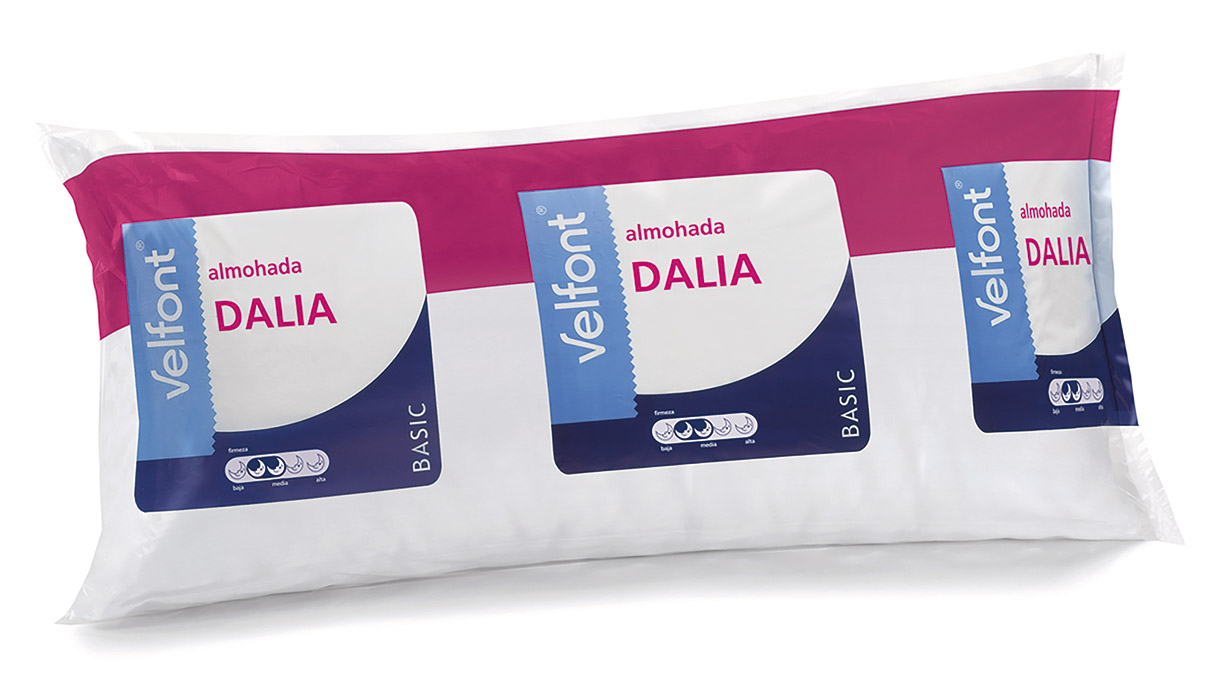 La almohada Dalia de Velfont es una almohada de firmeza media-baja y tejido de microfibra tacto seda, con relleno de fibra hueca siliconada y conjugada Neotherm® que aporta volumen, suavidad, ligereza y gran capacidad de recuperación. Es higiénica y transpirable, y muy resistente al uso y a los lavados.