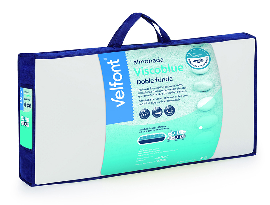 Almohada confeccionada con núcleo de formulación exclusiva 100% transpirable formado por células abiertas que permiten la libre circulación del aire. El núcleo de la Almohada Viscoblue está confeccionado con microbloques viscoelásticos que proporcionan un efecto masaje en la zona del cuello a la hora de dormir. Almohada personalizable de doble cara con diferente firmeza que porporciona máxima adaptabilidad, ofreciendo un descanso reparador.