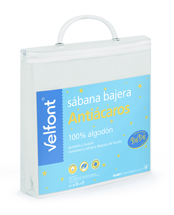 La sábana bajera Antiácaros de Velfont está confeccionada con tejido de punto de algodón 100% y tratamiento antiácaros Acarsan Natural® con extractos vegetales que impide el desarrollo de los ácaros en tejido proporcionando un descanso saludable de tu bebé. Ha sido testada científicamente y su eficacia resiste a los sucesivos lavados.