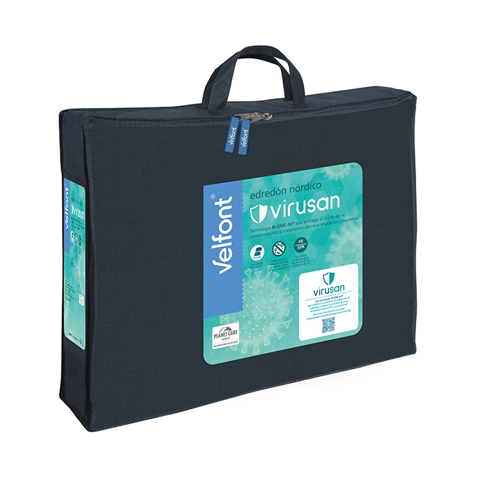 El edredón nórdico Visuran de Velfont está confeccionado con tejido de microfibra de tacto extrasuave que incorpora el tratamiento Virusan® antibacterias y reductor viral. El relleno de este edredón nórdico es de fibra hueca siliconada conjugada Neotherm® de primera calidad, que combina una excelente capacidad térmica y un elevado confort.