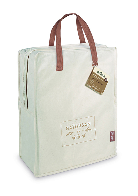 El cubrecolchón Max Cotton viene en una bonita bolsa multiuso confeccionada con algodón canvas de color beige, con asas marrones y cremallera para poder cerrarla.