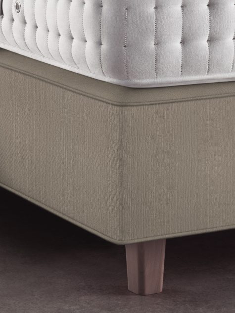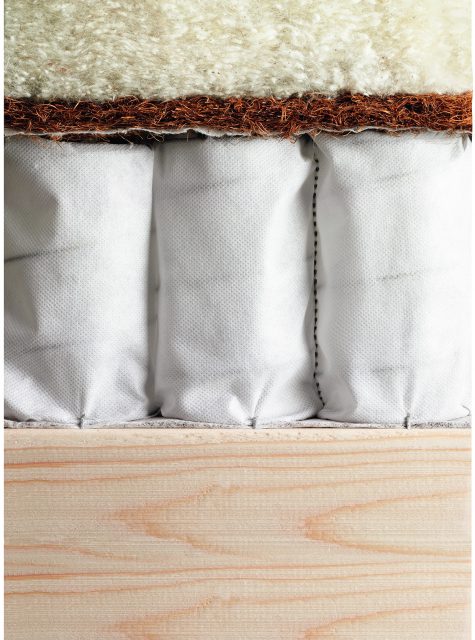 Muelles ensacados, cosidos en sacos individuales y colocados a mano en una sólida estructura de madera. El De Luxe está tapizado con fibra de coco, algodón y lana de vellón británica.
