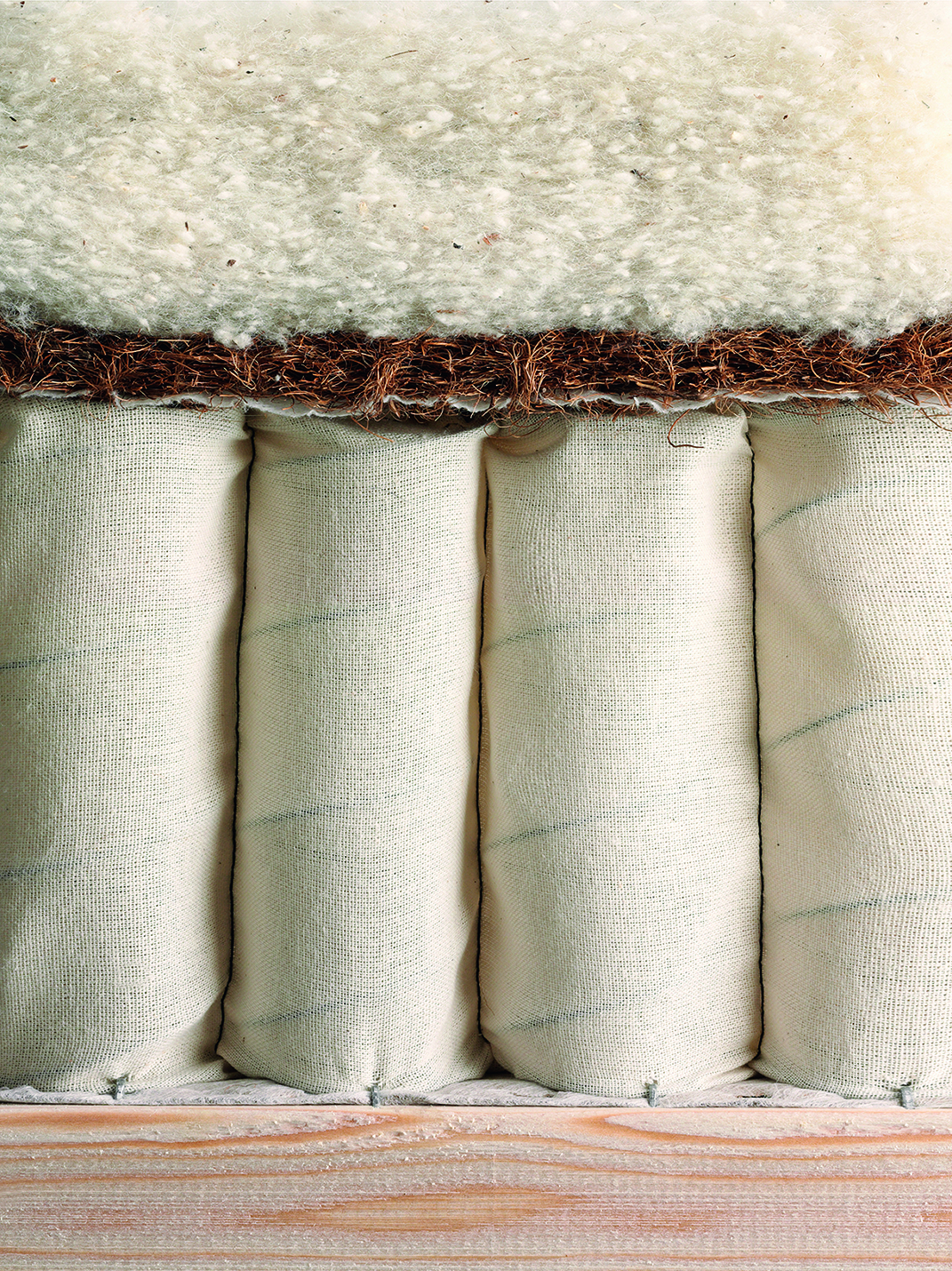 Construido con una estructura de madera maciza y una fila de muelles ensacados. Por fuera, luce fibra de coco, lana británica y algodón.