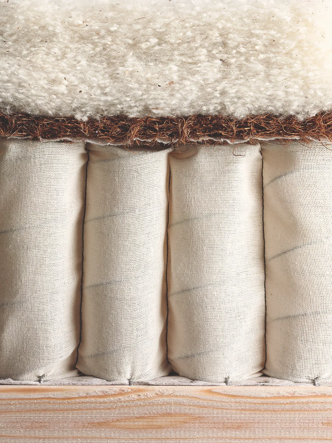 Construido con una estructura de madera maciza y una fila de muelles ensacados. Por fuera, luce fibra de coco, lana británica y algodón.